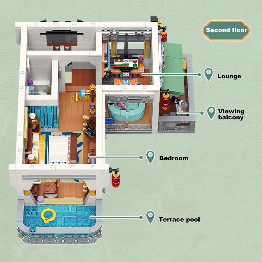 - The architectural model has two floors. On the first floor there is a Chinese retro style hall, with a pond, small bridges, lotus flowers and potted plants. The second floor has an L-shaped structure that includes playgrounds, bathrooms, rooms and other areas as well as many decorative appliances. With 6 mini figures, the scene is realistic